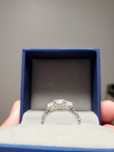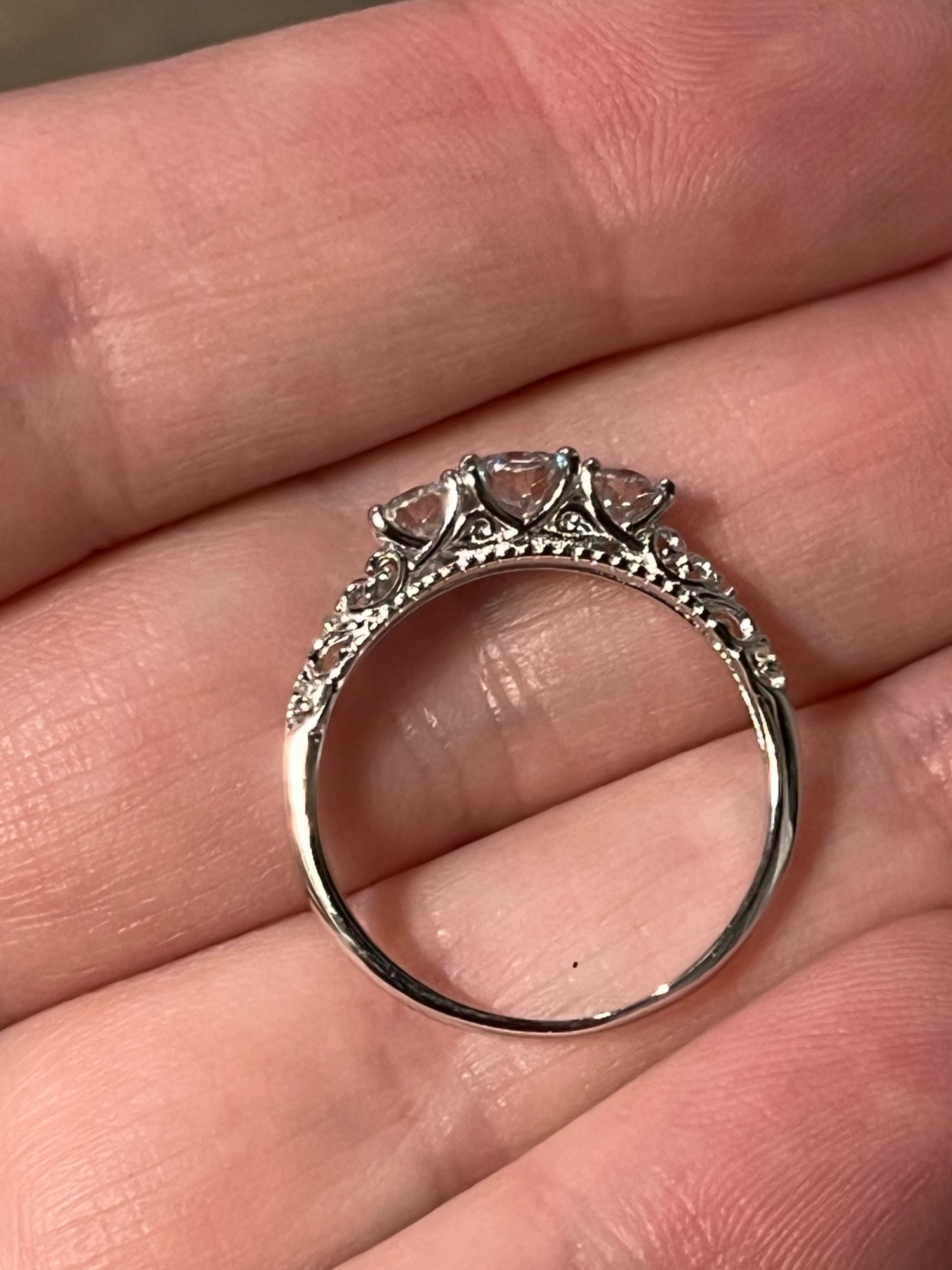 The ring is neat! Beautiful! The moissanite sparkle as expected, each stone has a certificate, three stones-three certificates! I am very satisfied with the ring!!! Took size 7 to 17 Russian size! Looking to get some earring now.