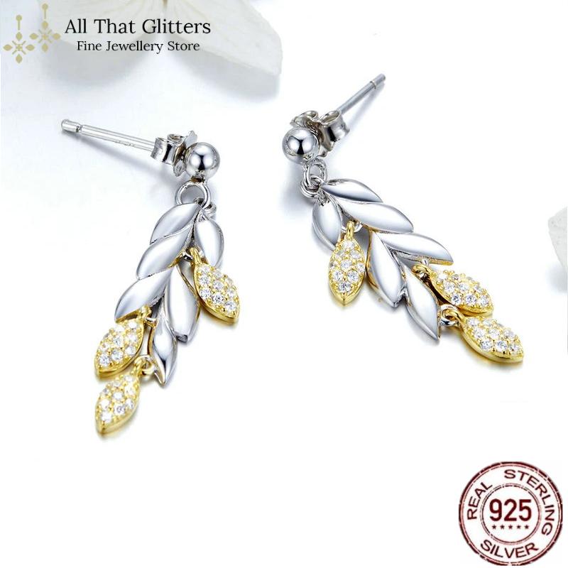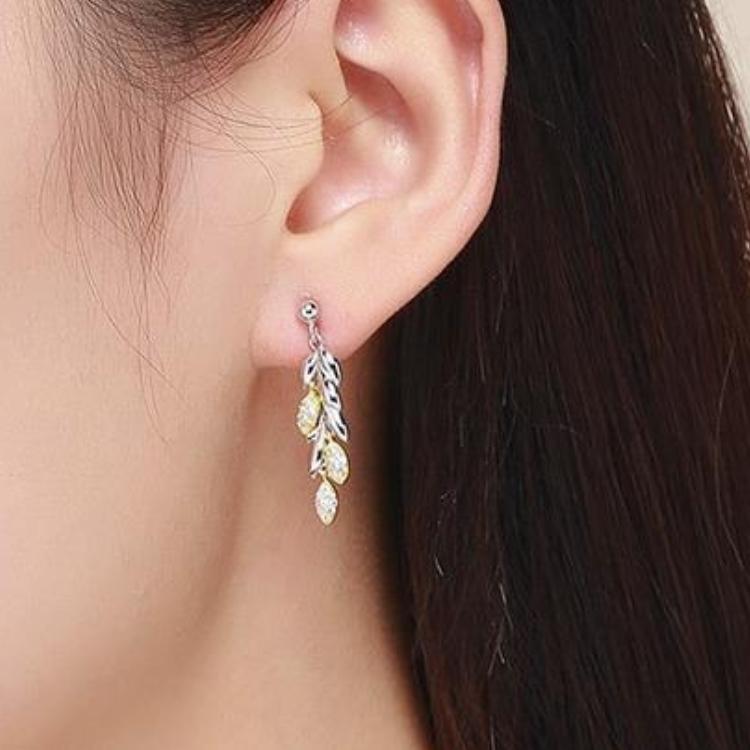Add a little sparkle and shine to your look with these Unique Gold color Wheat Drop Cubic Zirconia earrings designed in Sterling Silver. Expertly crafted with a Platinum Plated finish, these earrings feature a truly stunning wheat design with gold-toned leaves and High quality Cubic Zirconia setting for maximum shine.